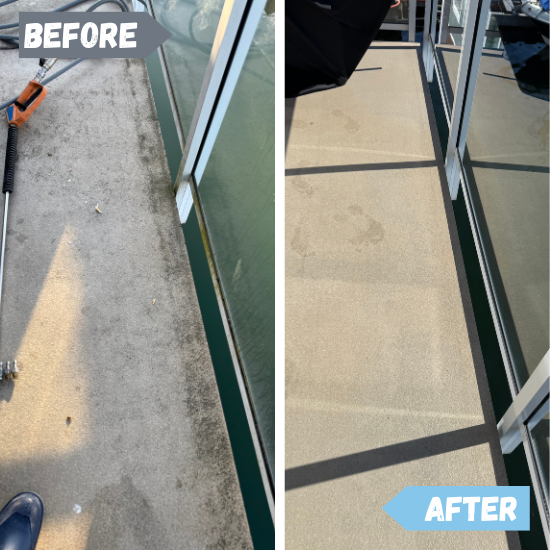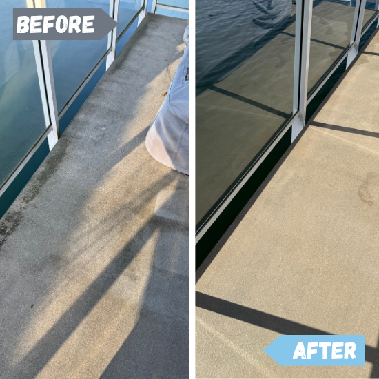 Detailed Balcony & Railing Cleaning: The vinyl balcony, with its stunning glass panels, is a key feature of this home. We performed a meticulous pressure washing on the vinyl floor to remove all embedded dirt and footprints. The glass panels, white railings, and frames were all hand-cleaned to ensure a sparkling, streak-free finish, making the entire outdoor space inviting and ready for summer.