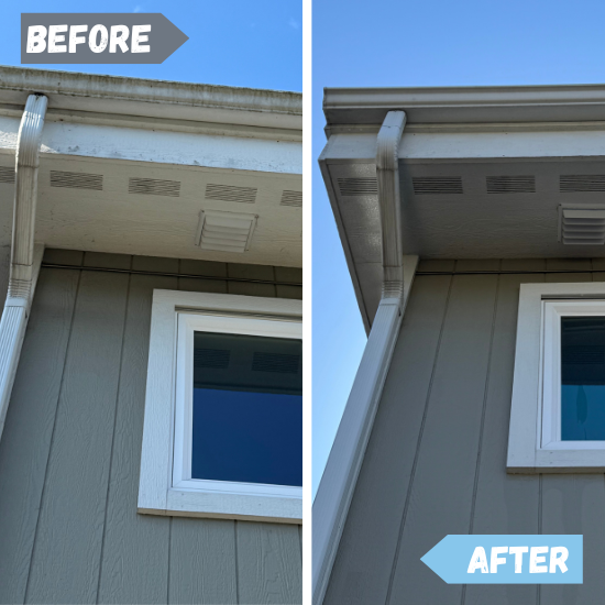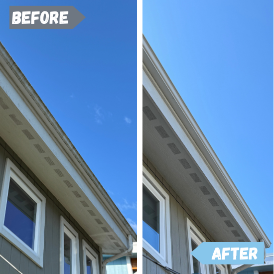 Full House Wash & Gutter Cleaning: The home’s siding, soffits, and window frames were covered in dirt and green algae. Our house washing service gently cleansed these surfaces, restoring the home’s vibrant colour. We also performed a thorough exterior gutter cleaning, removing the dark streaks and buildup, which instantly improved the home’s curb appeal. The soffits were carefully cleaned, brightening the entire roofline.