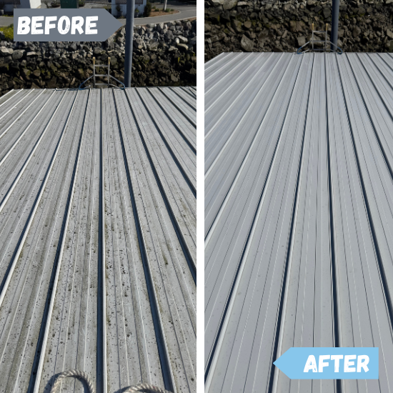 Safe Metal Roof Soft Wash: The metal roof had accumulated a layer of grime and organic growth. Instead of using high-pressure washing, which can damage metal roofing, we employed our professional soft wash technique. This method uses specialized, eco-friendly cleaning solutions at low pressure to kill algae and lift dirt without harming the surface. For complete safety on the sloped roof, our technicians used professional-grade harnesses at all times. This roof cleaning service left the metal looking bright, clean, and brand new.